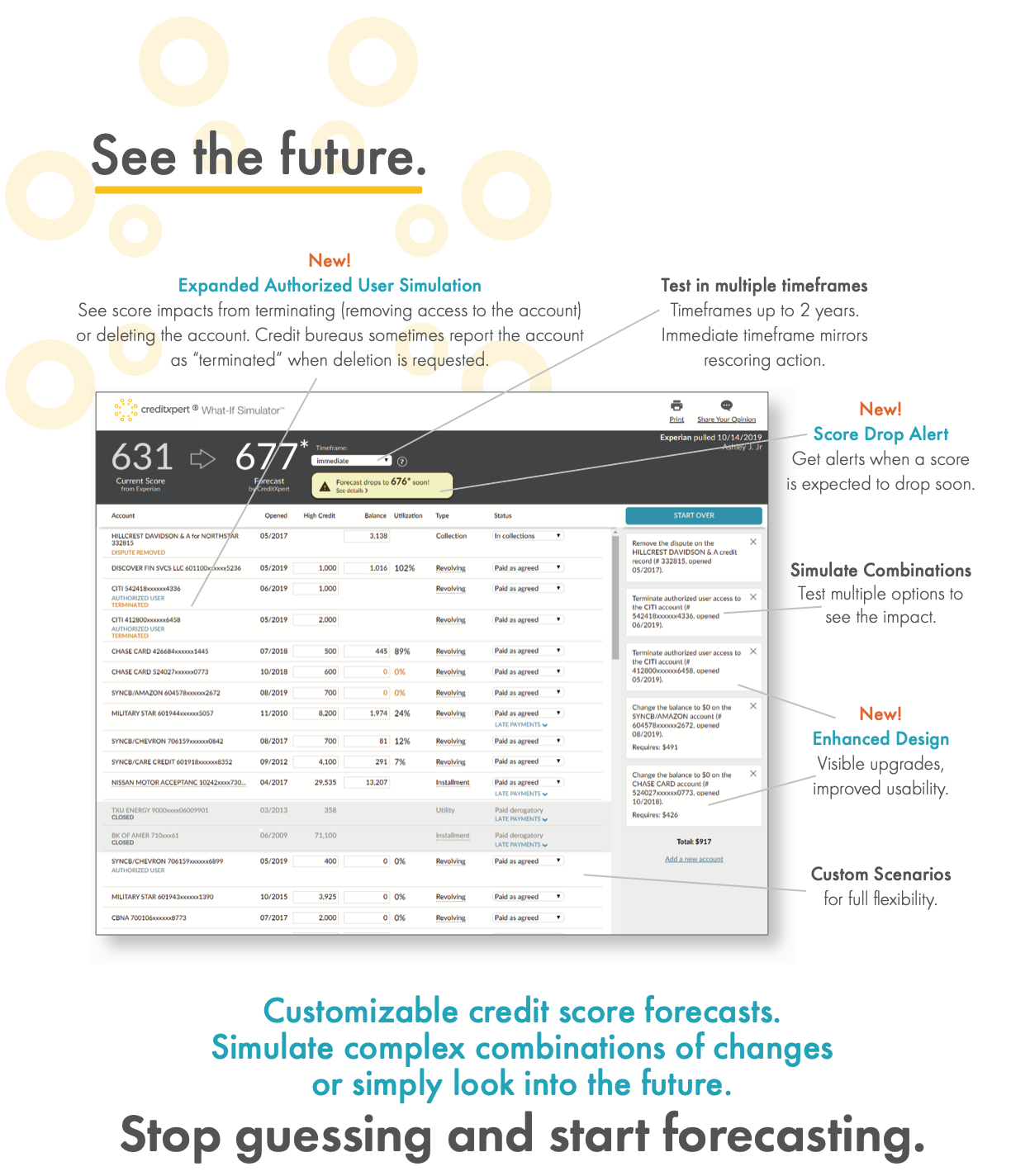 Credit Massage Simulator - puts the control in your hands. You can get a score forecast that simulates the impact of complex changes or pending activities that affect your credit score. Safely test changes before taking action - or mitigate upcoming issues - so you can make informed decisions, be proactive, and find just the right actions to take.